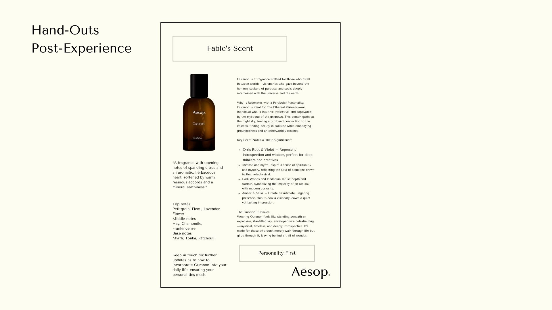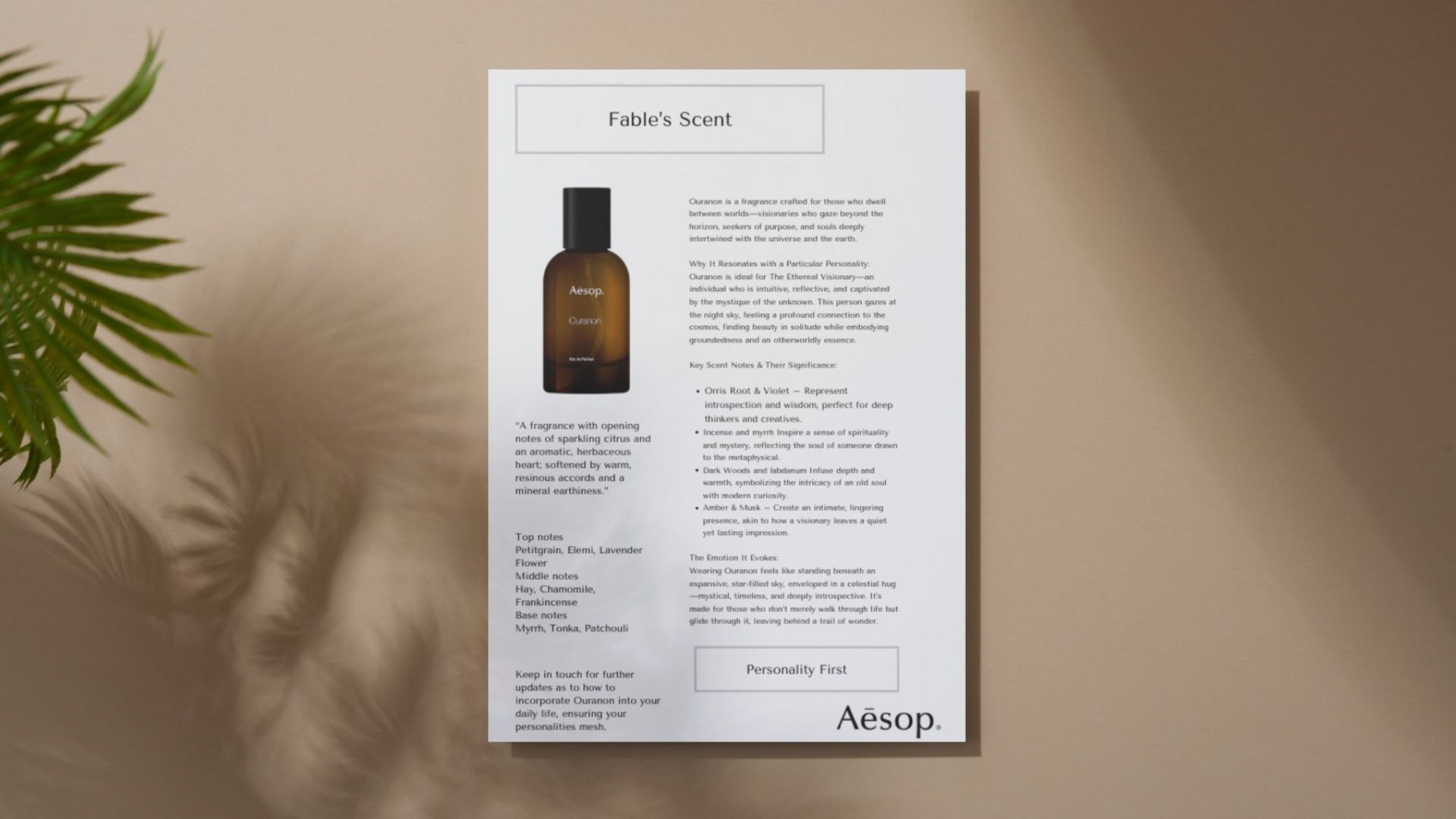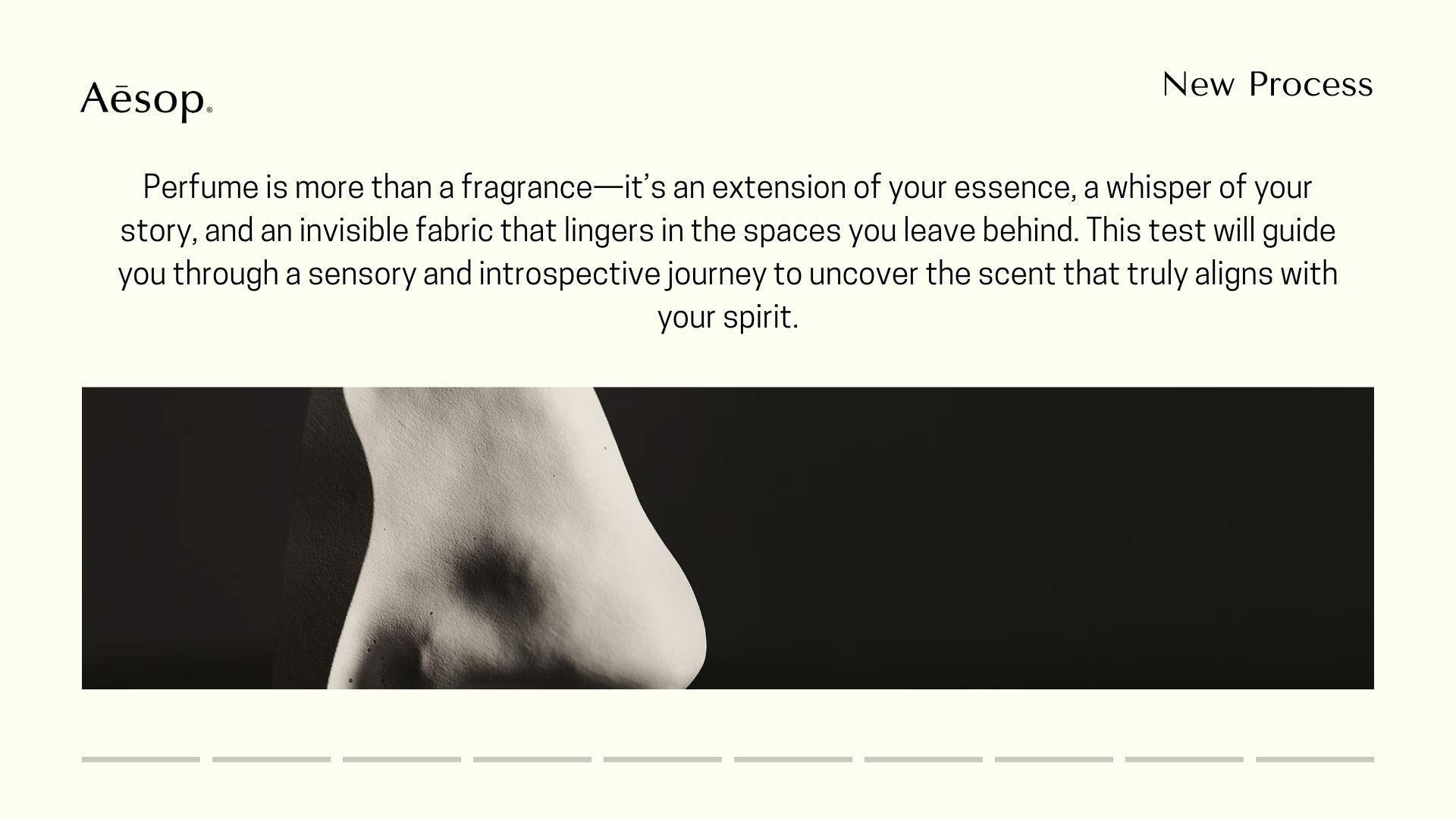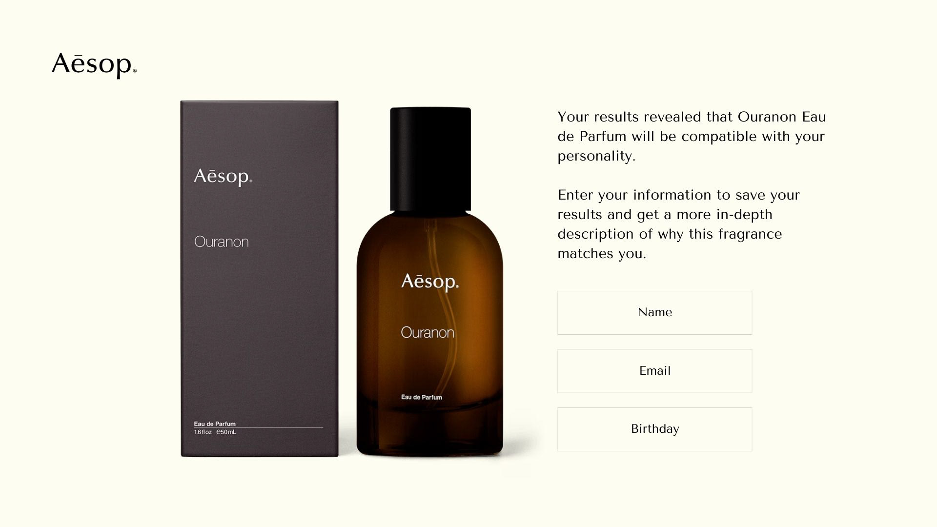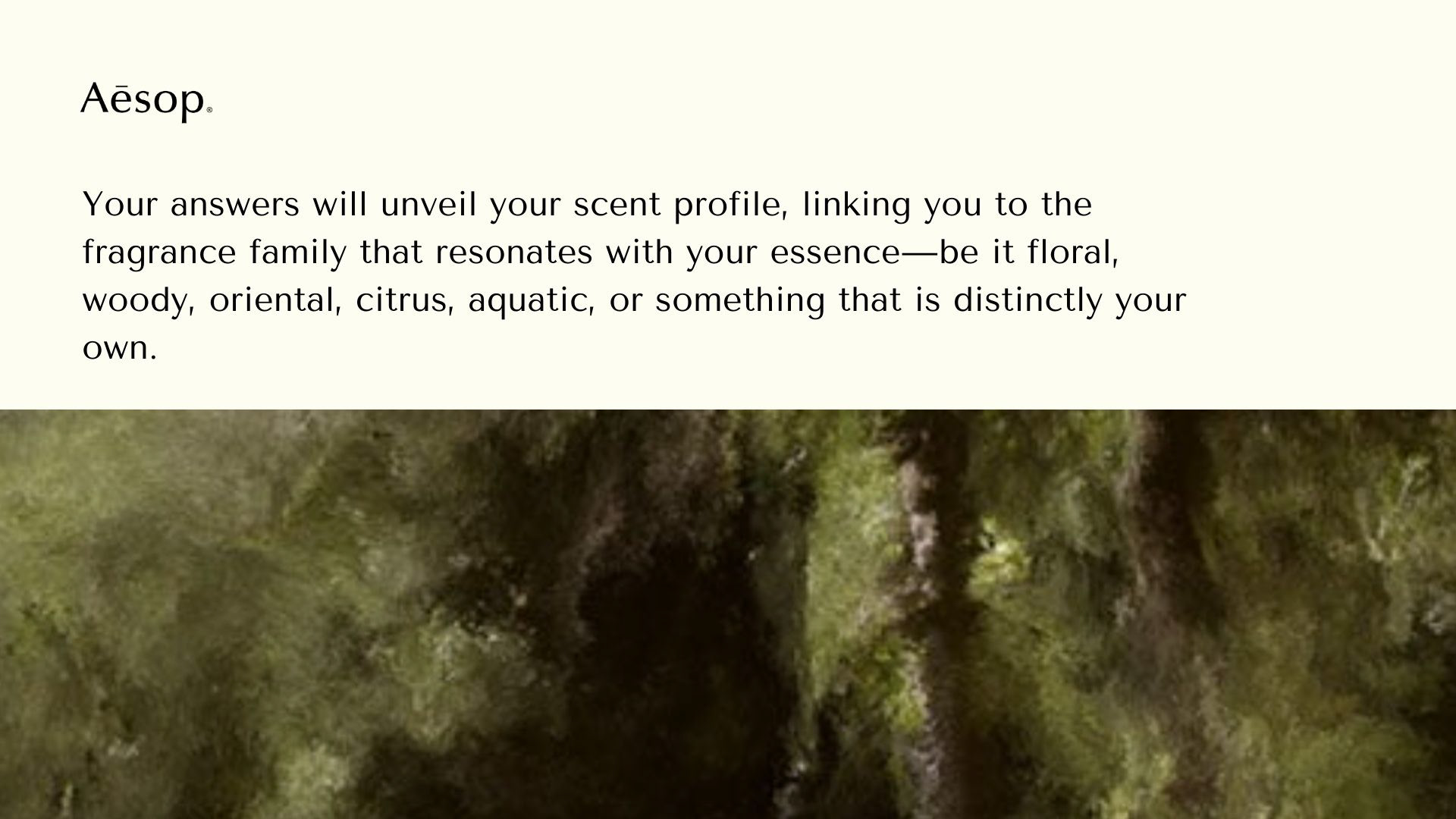 For SCAD ADBR 255, we were tasked to incorporate an interactive element within an existing brand, ensuring it fills a gap within the market. I created an interactive psychology-based scent assessment for Aesop fragrances, ensuring each fragrance chosen "aligns with the fabric of your being".