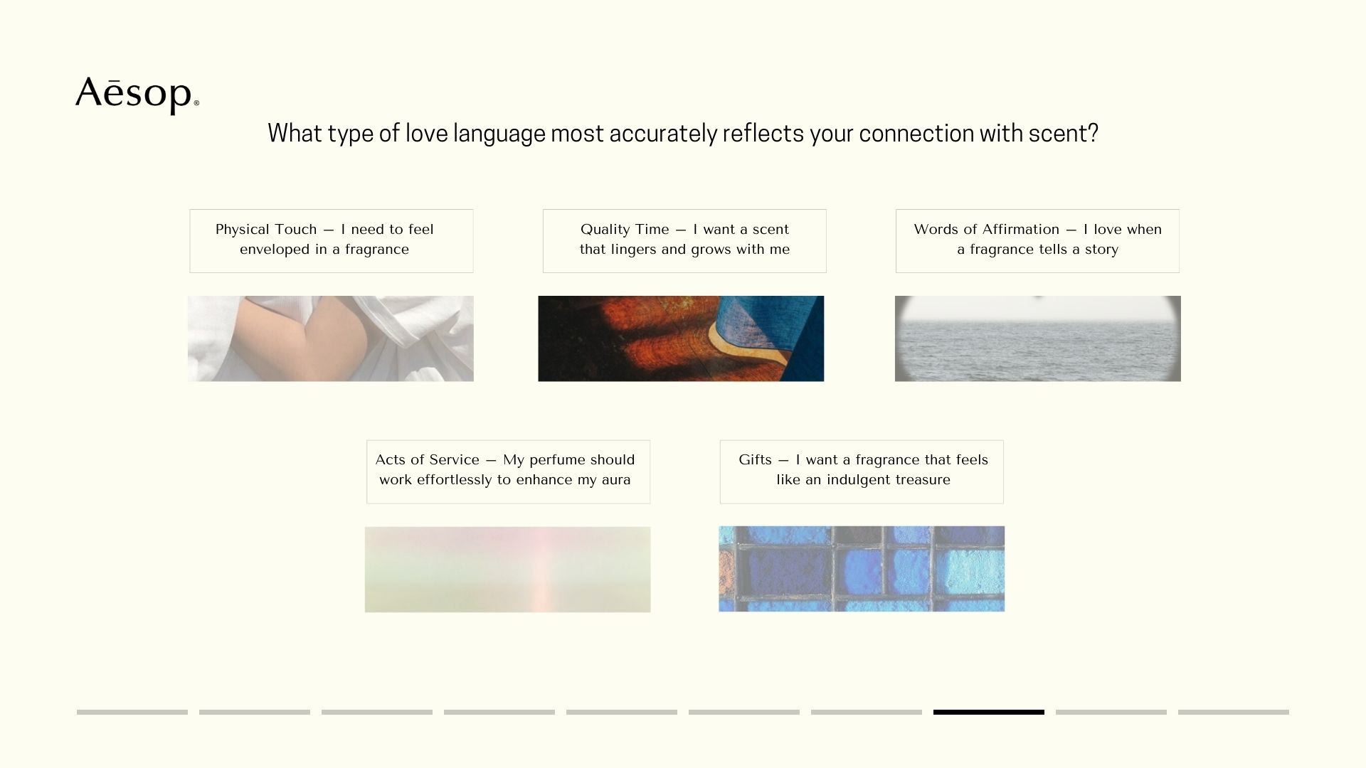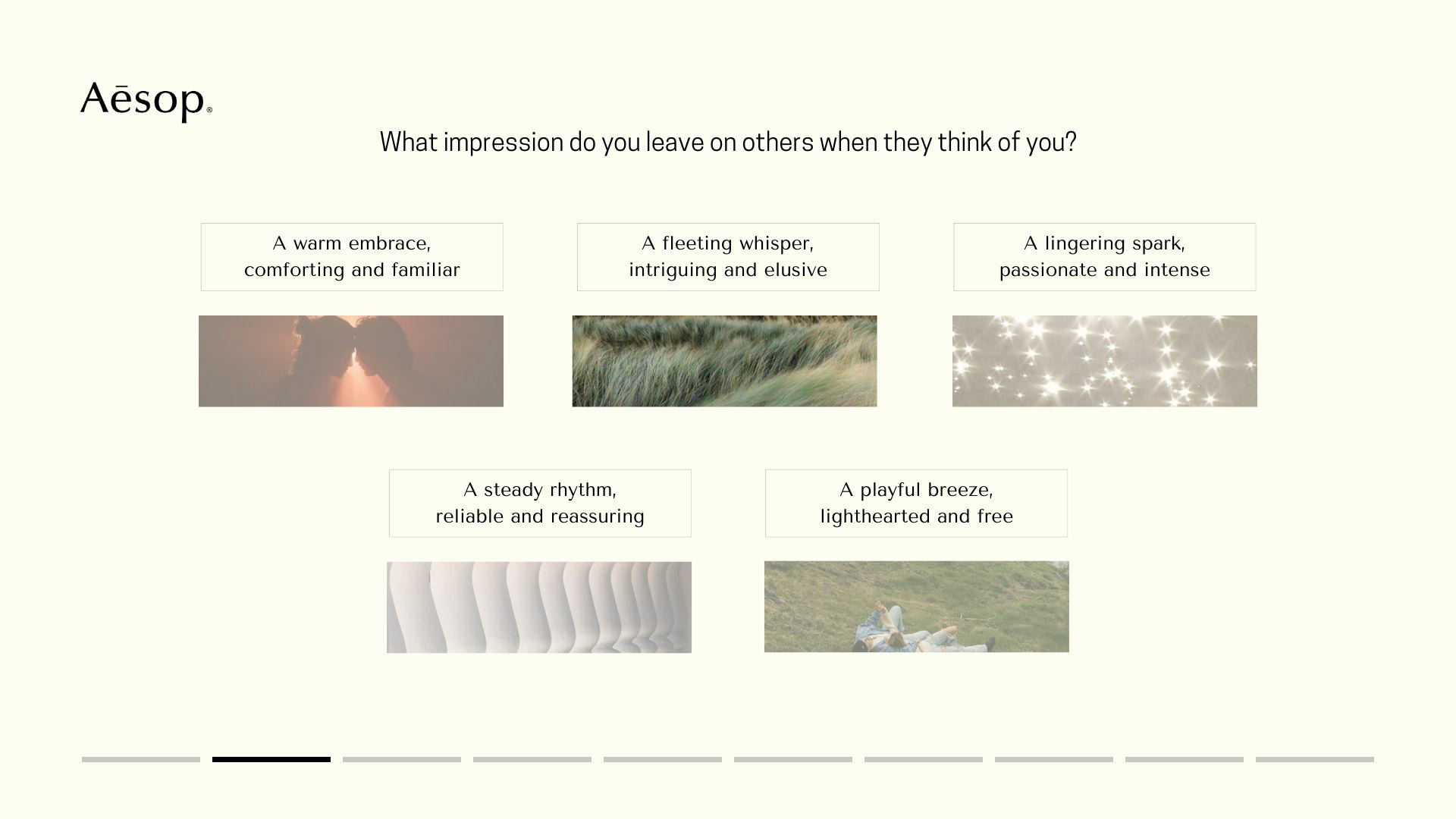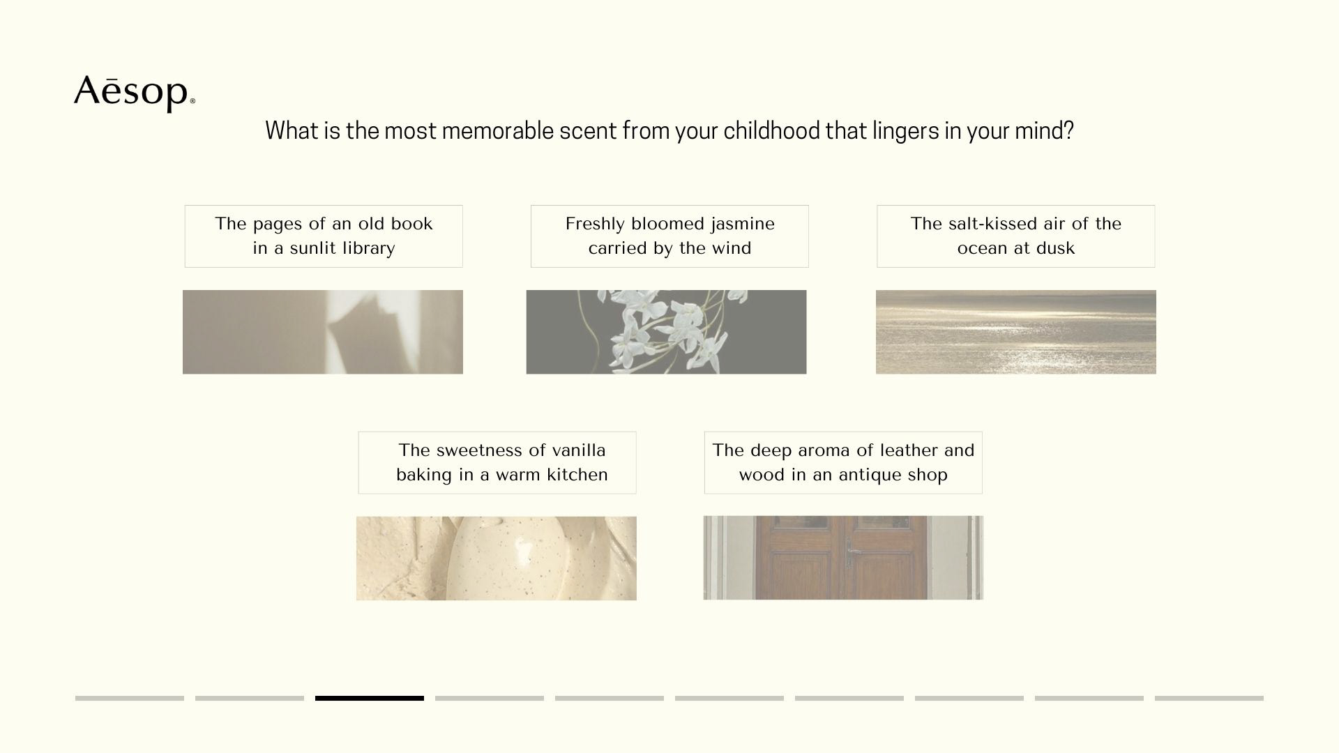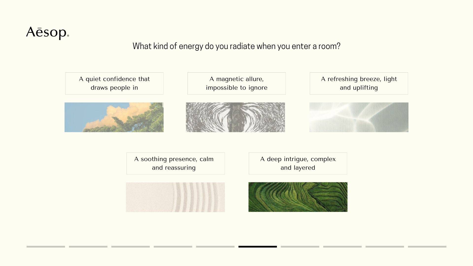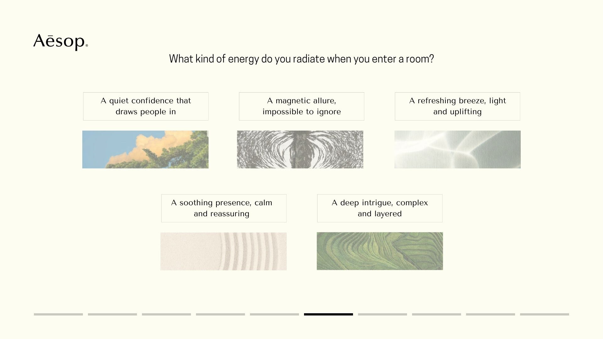 For SCAD ADBR 255, we were tasked to incorporate an interactive element within an existing brand, ensuring it fills a gap within the market. I created an interactive psychology-based scent assessment for Aesop fragrances, ensuring each fragrance chosen "aligns with the fabric of your being".