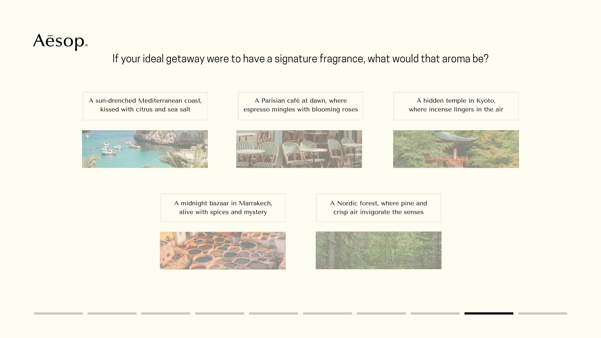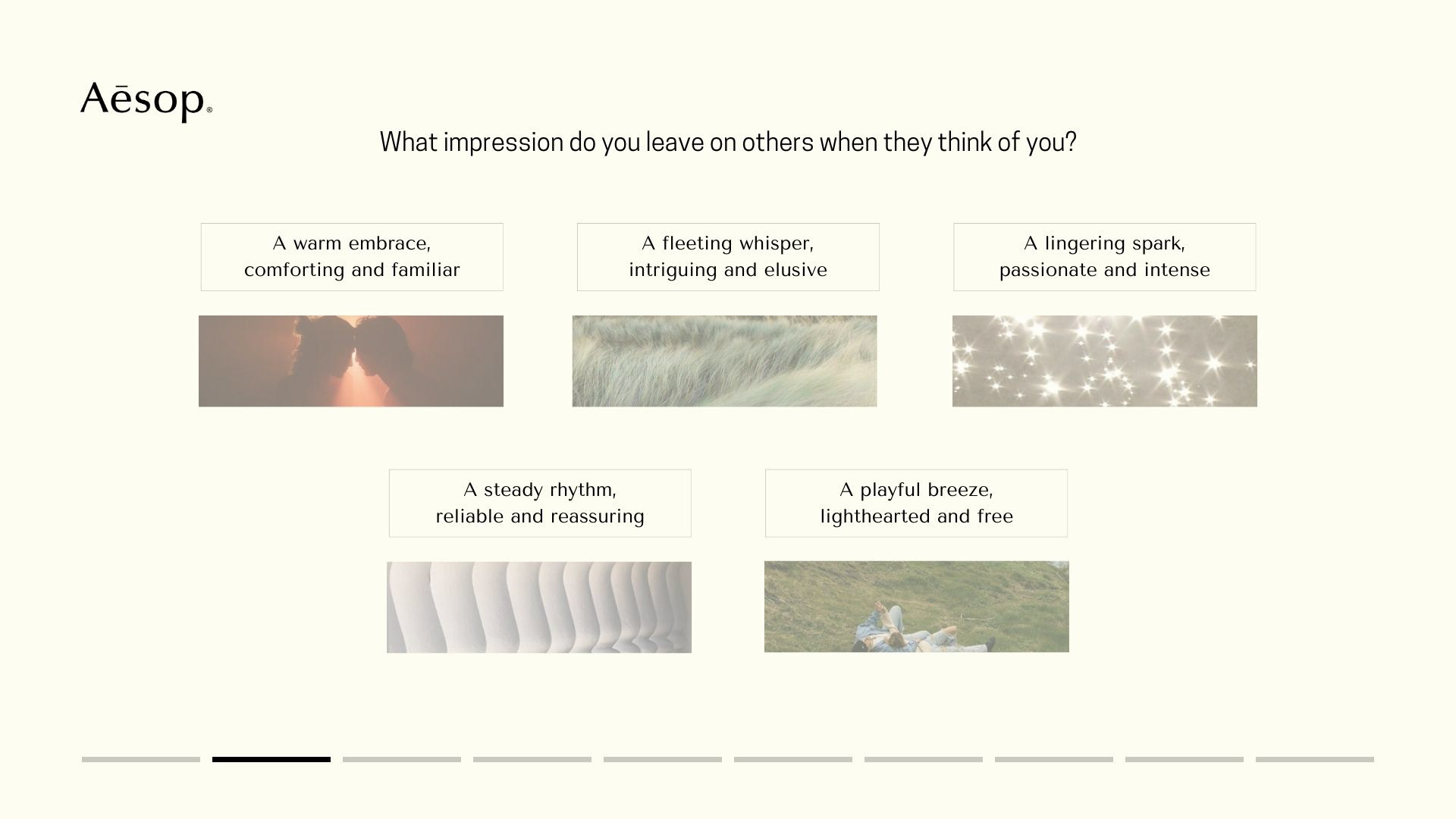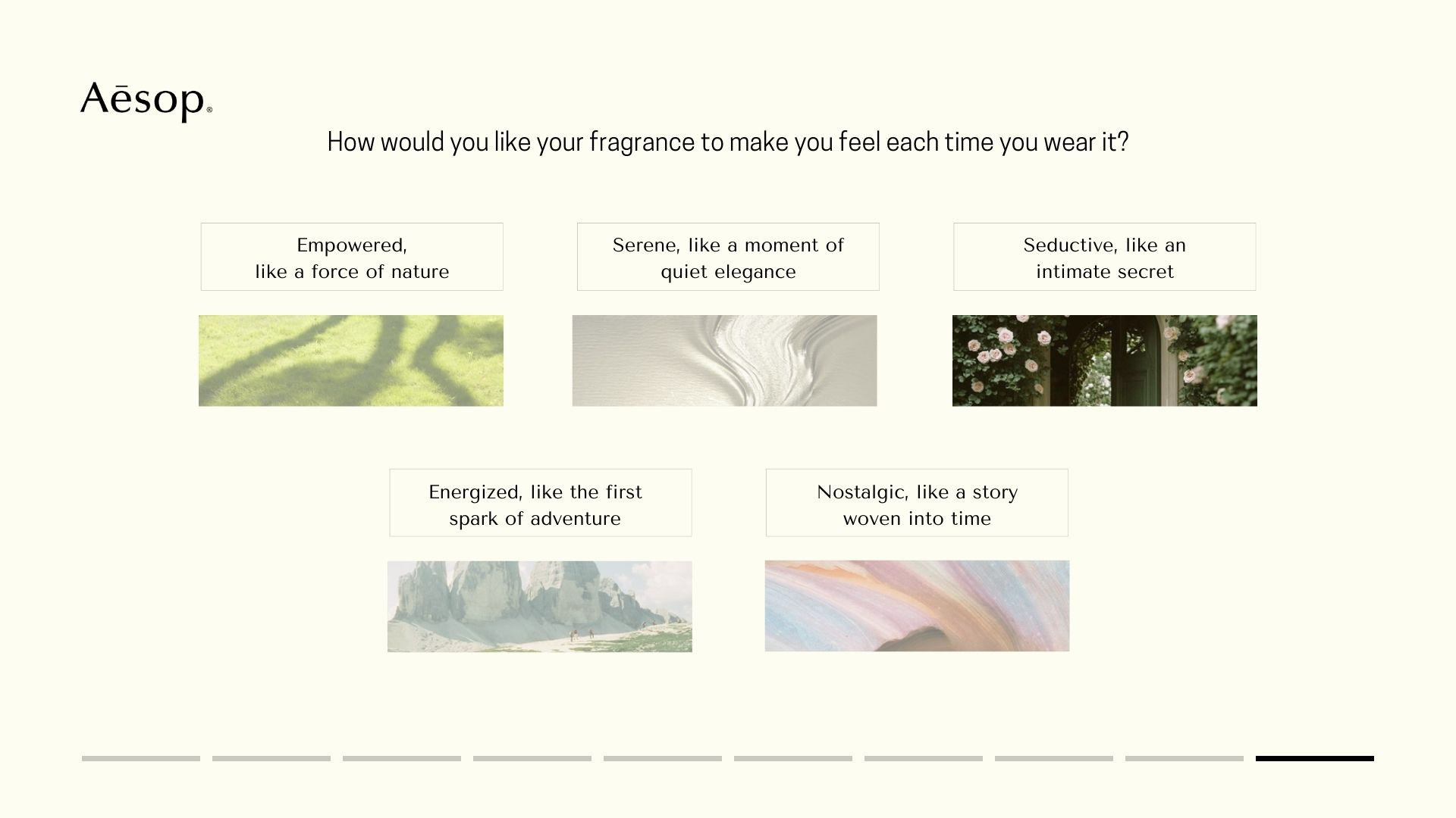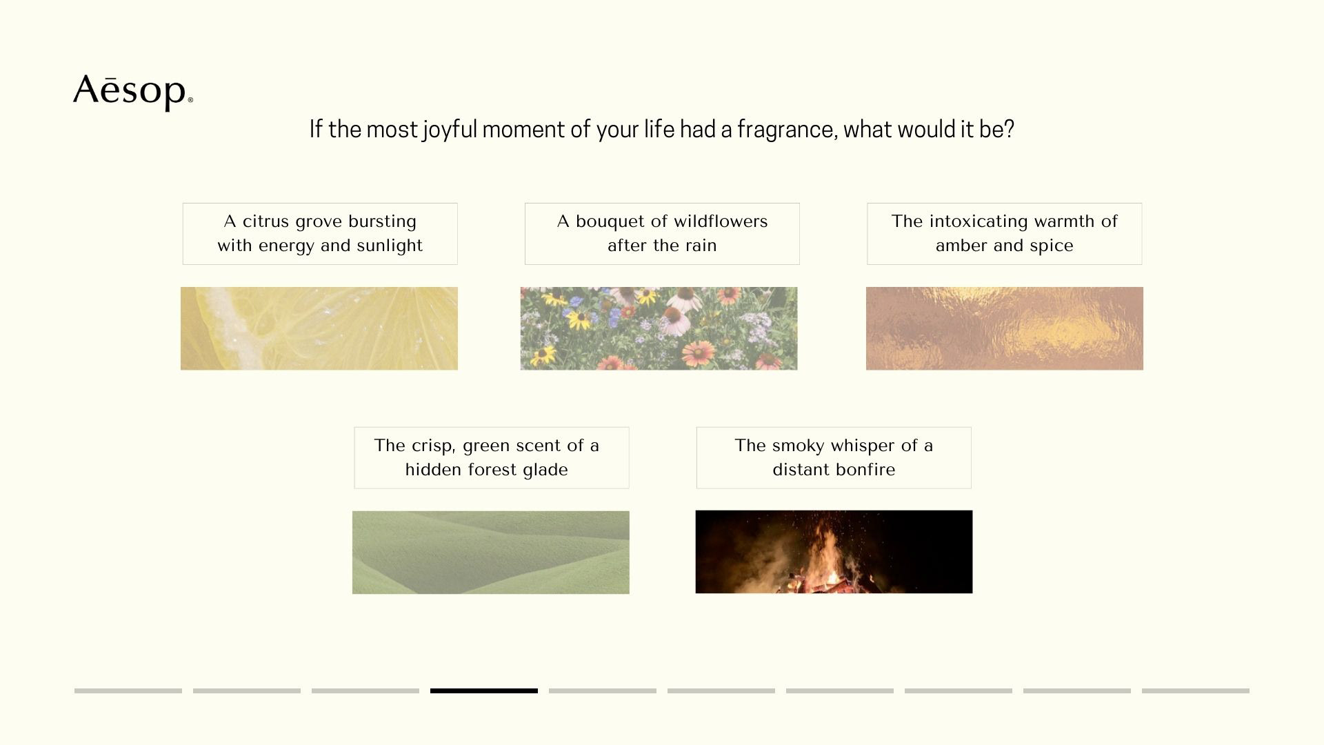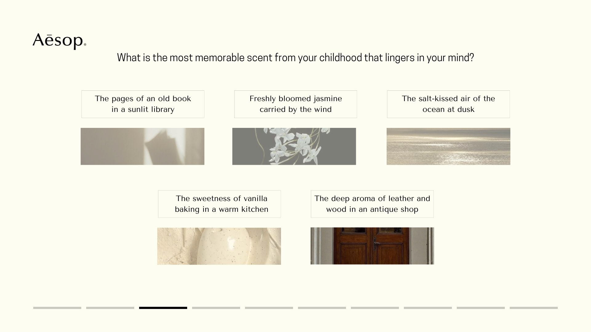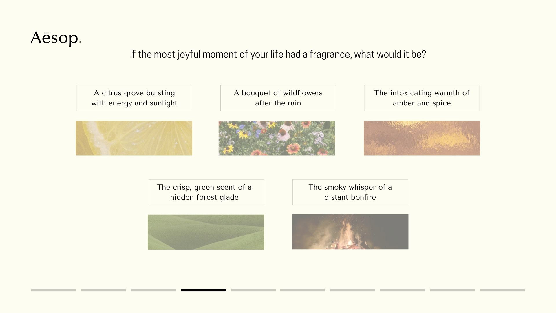 For SCAD ADBR 255, we were tasked to incorporate an interactive element within an existing brand, ensuring it fills a gap within the market. I created an interactive psychology-based scent assessment for Aesop fragrances, ensuring each fragrance chosen "aligns with the fabric of your being".