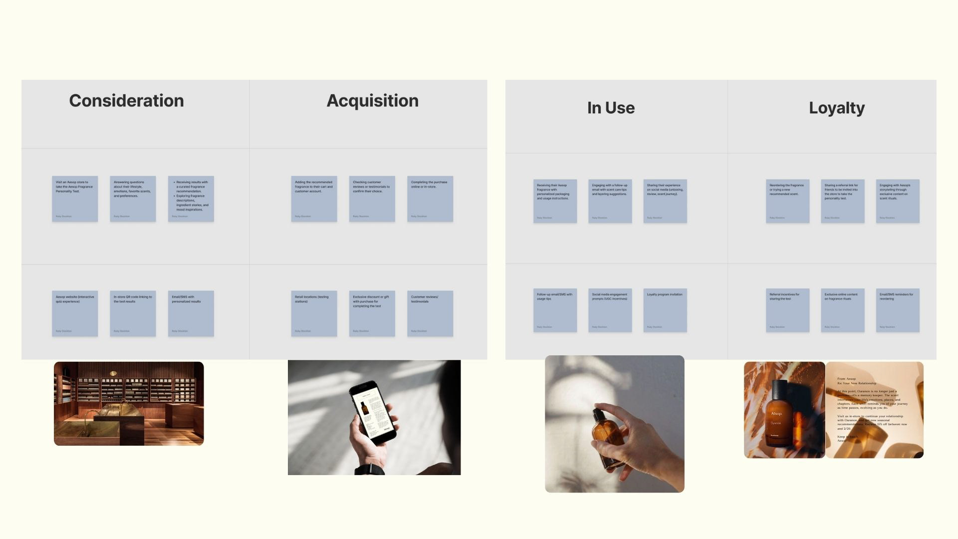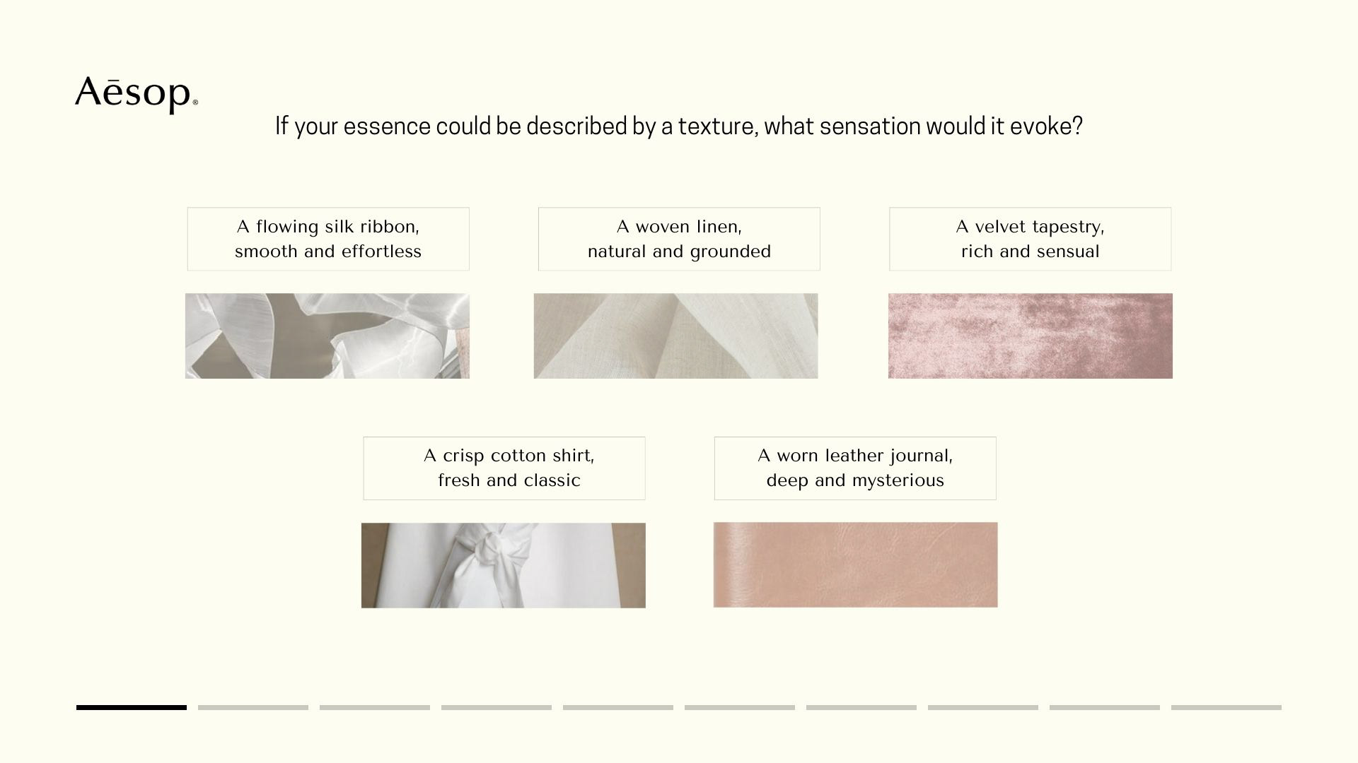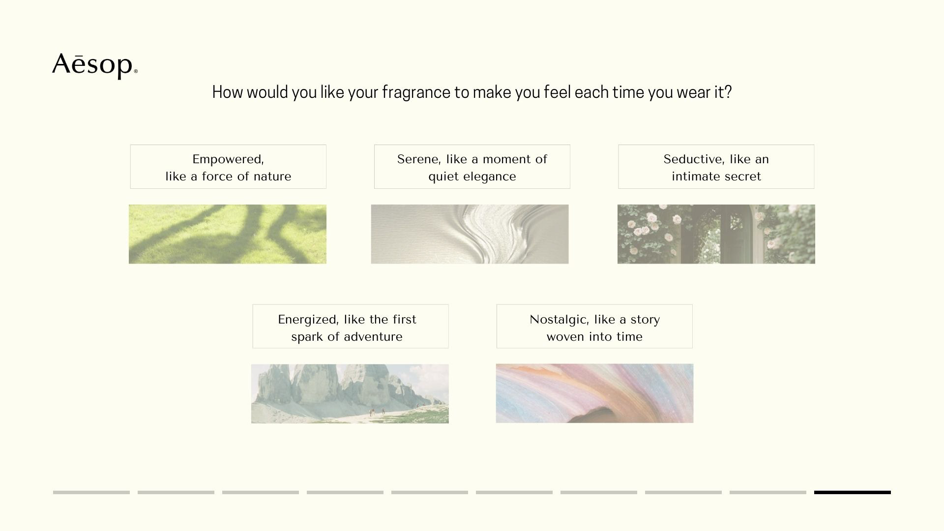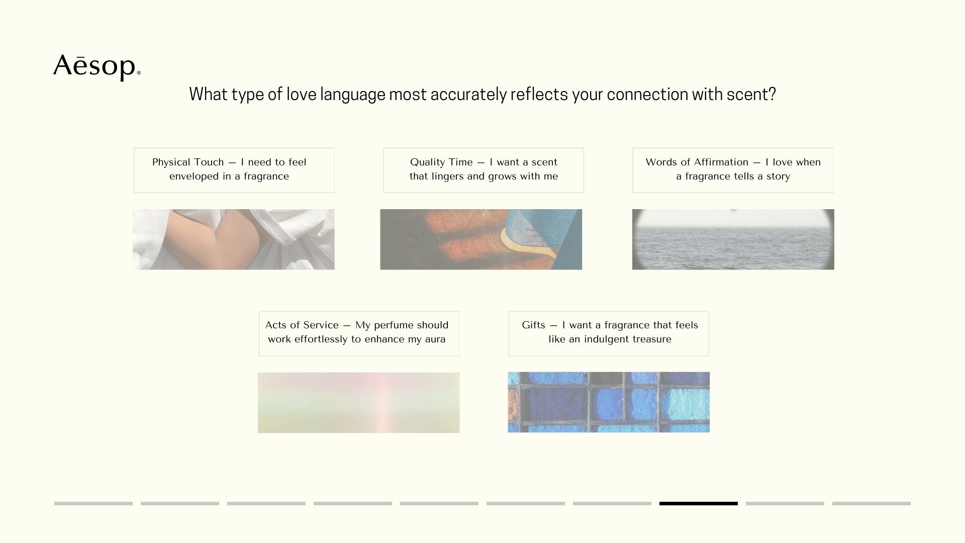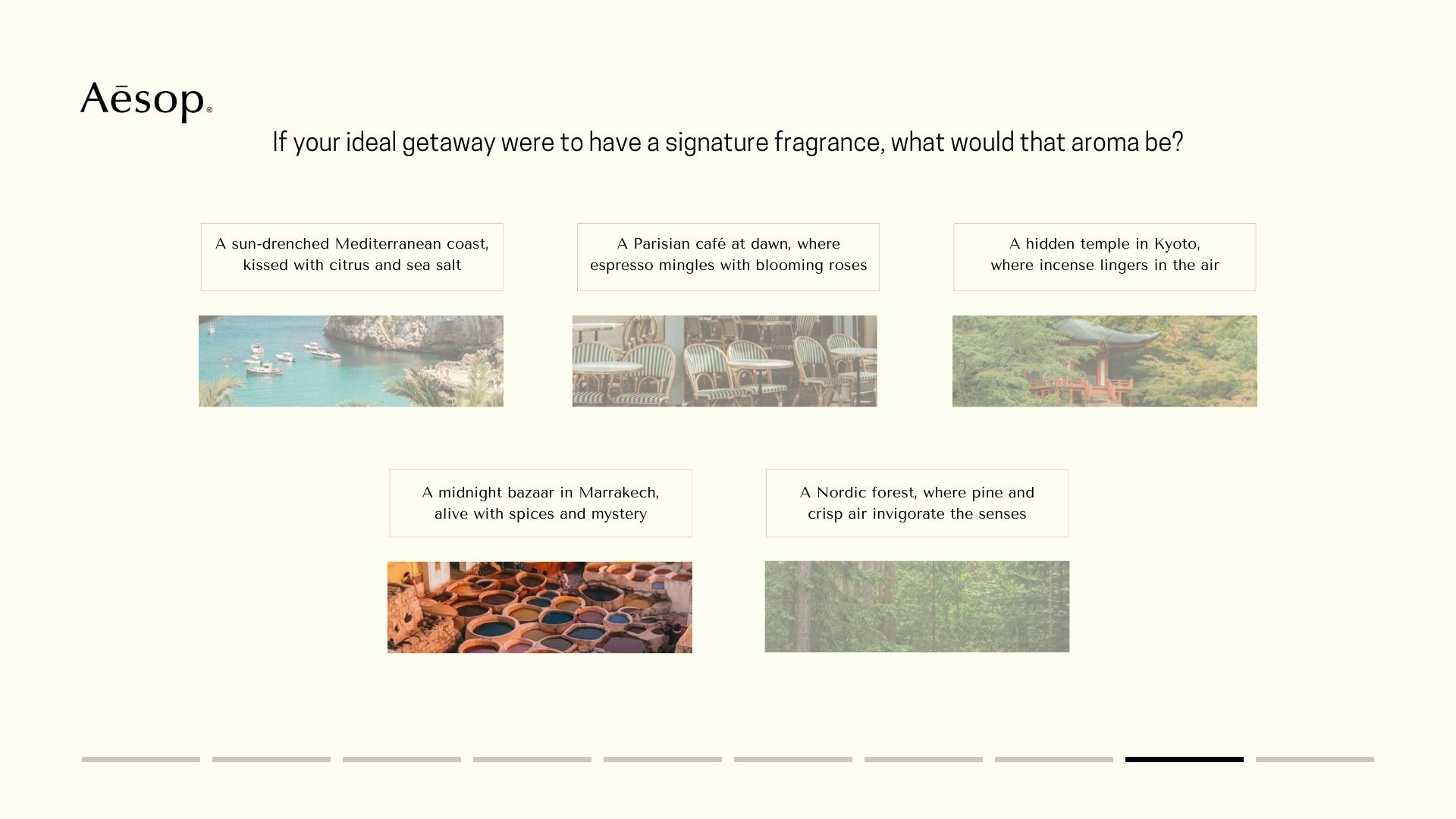 For SCAD ADBR 255, we were tasked to incorporate an interactive element within an existing brand, ensuring it fills a gap within the market. I created an interactive psychology-based scent assessment for Aesop fragrances, ensuring each fragrance chosen "aligns with the fabric of your being".