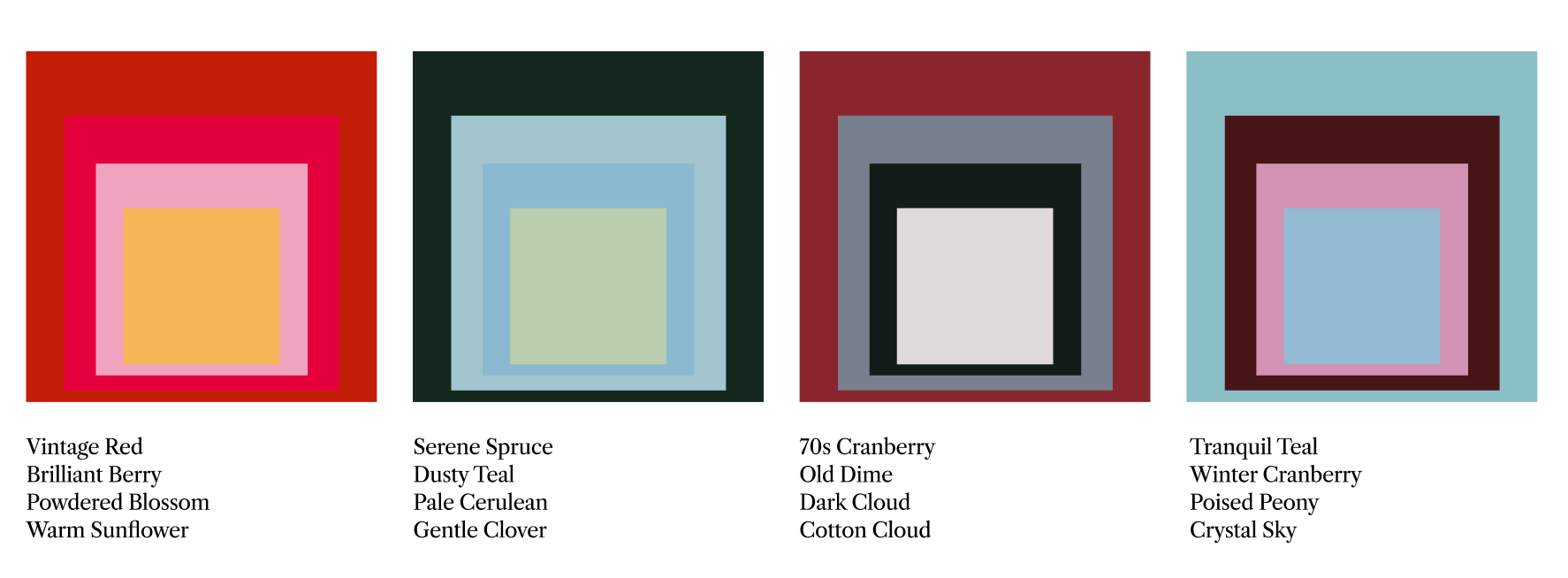 Stacked compositions echoed Albers’ work, while a model-free approach emphasized form and color. Clever color names added a curated touch, and the bold logo reinforced brand presence. Muted backgrounds made hues pop, and minimalist copy created a gallery-like feel.