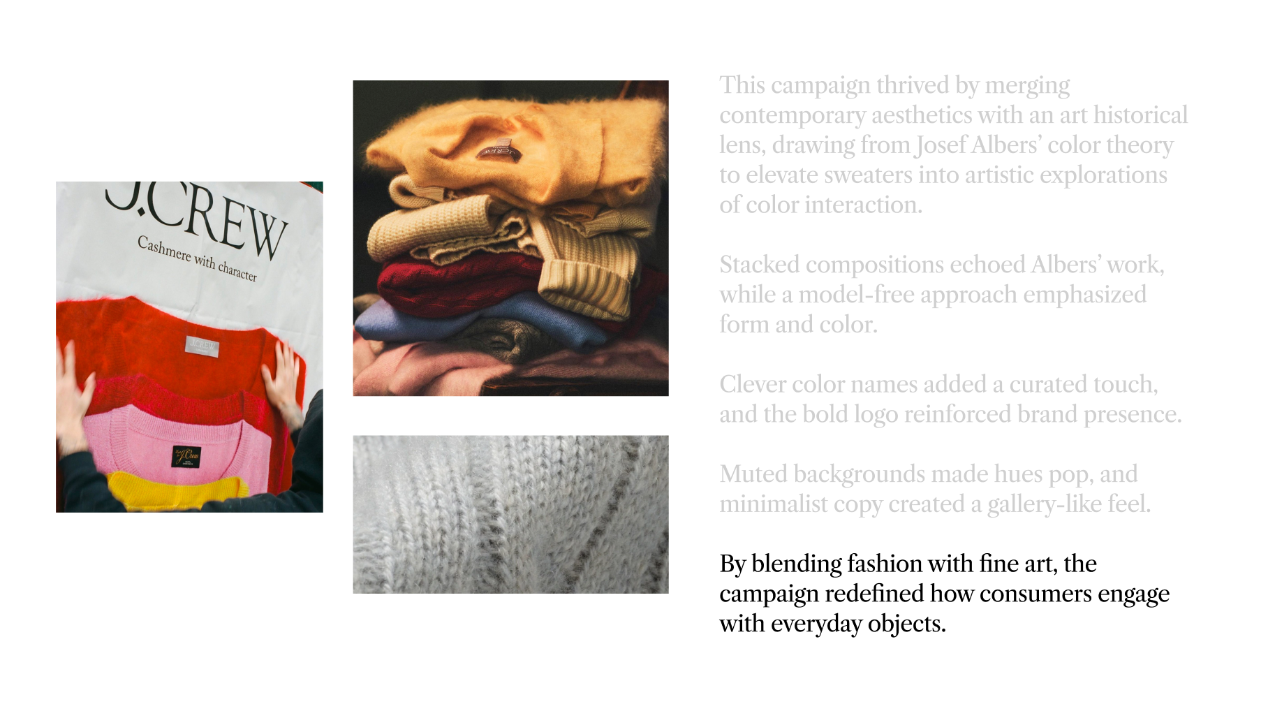 This campaign thrived by merging contemporary aesthetics with an art historical lens, drawing from Josef Albers’ color theory to elevate sweaters into artistic explorations of color interaction.