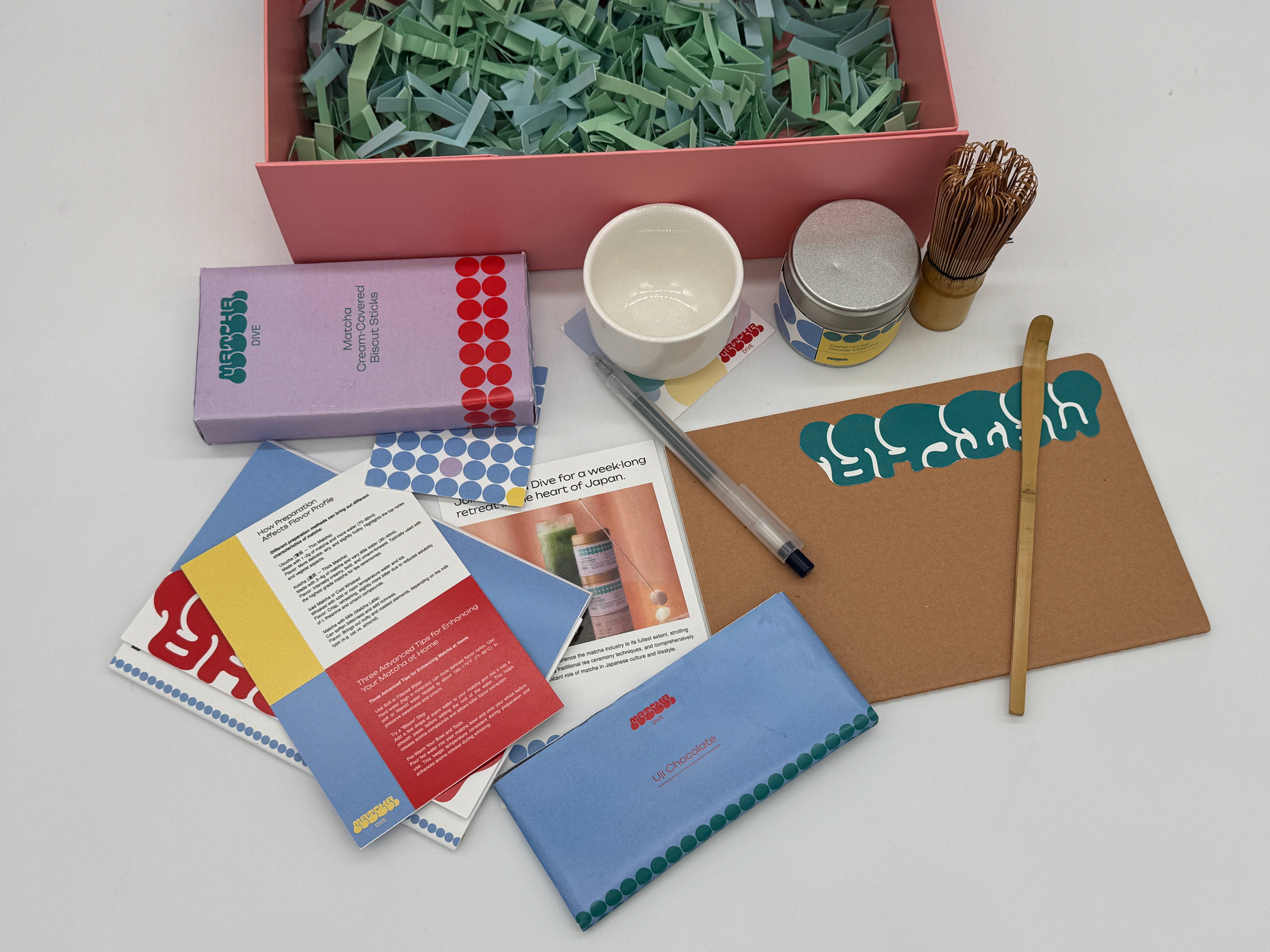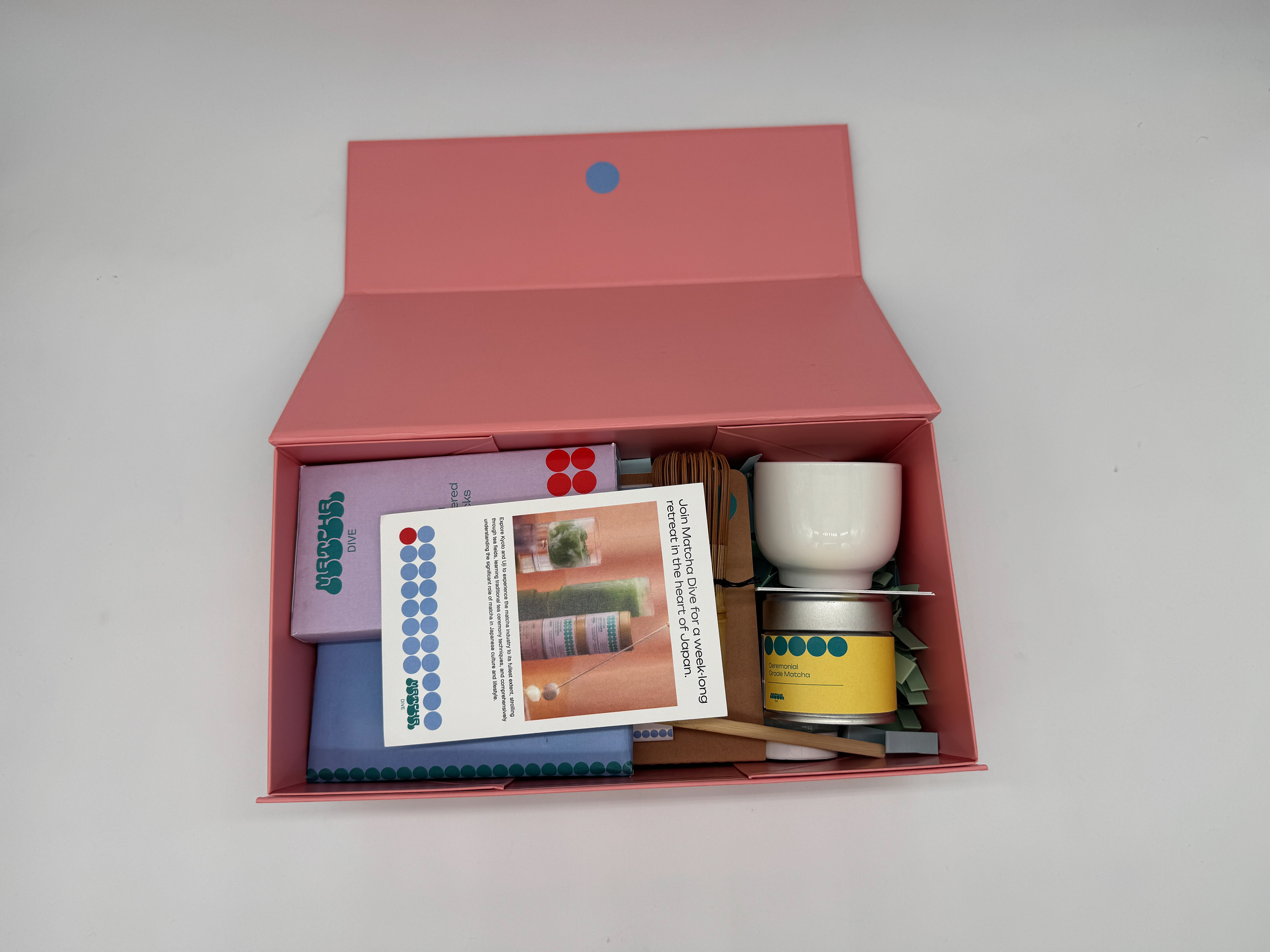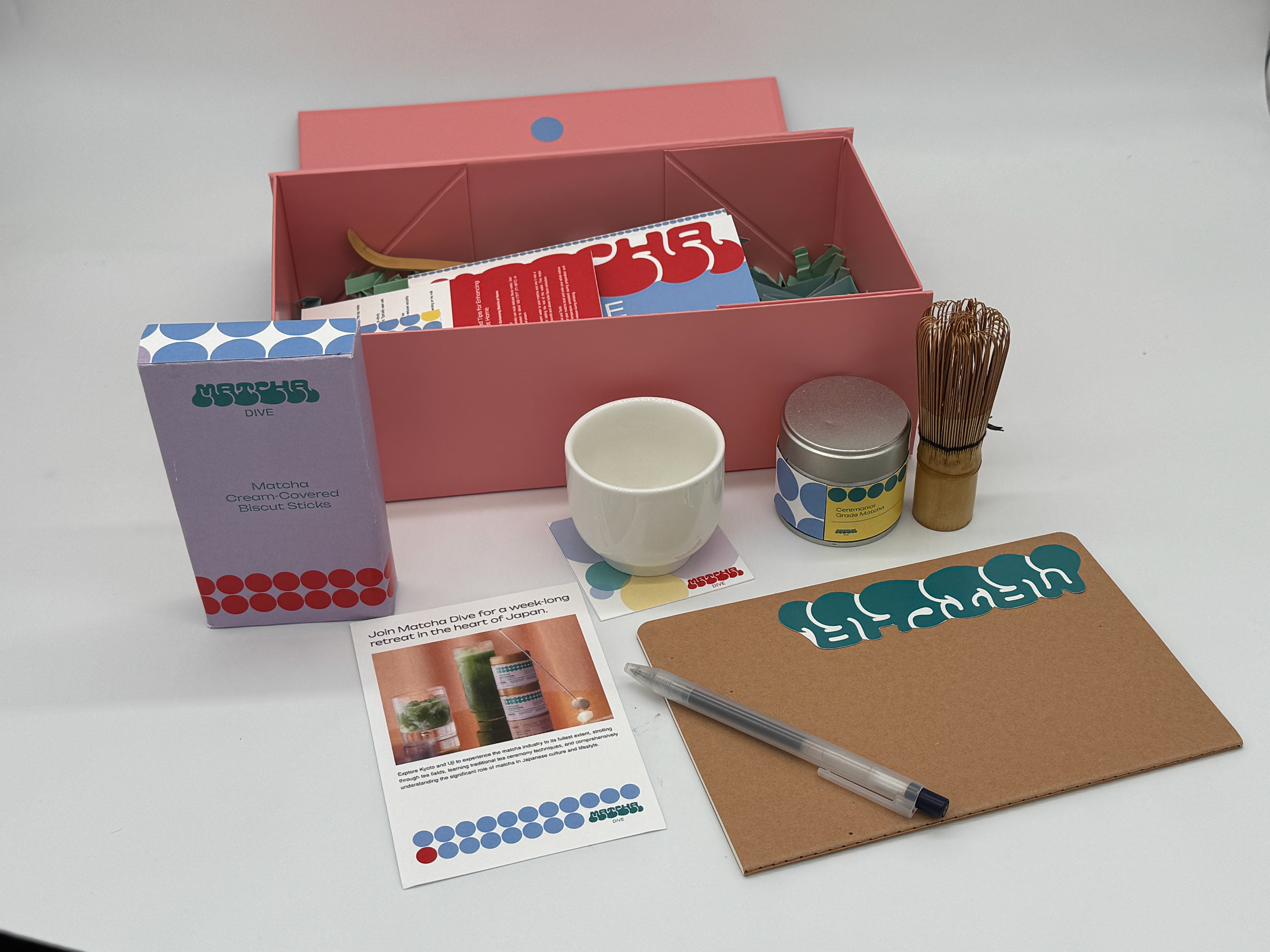 Our assignment was to create a kit for an interactive, 3-day experience. I chose to create a retreat in Japan to experience matcha in its traditional ways, touring fields, staying in Minka, and enjoying matcha in tea ceremonies. Each element of the box was designed using Matcha Dive as an inspiration, with original interpretations of how the brand could adapt across multiple CPGs and collateral.